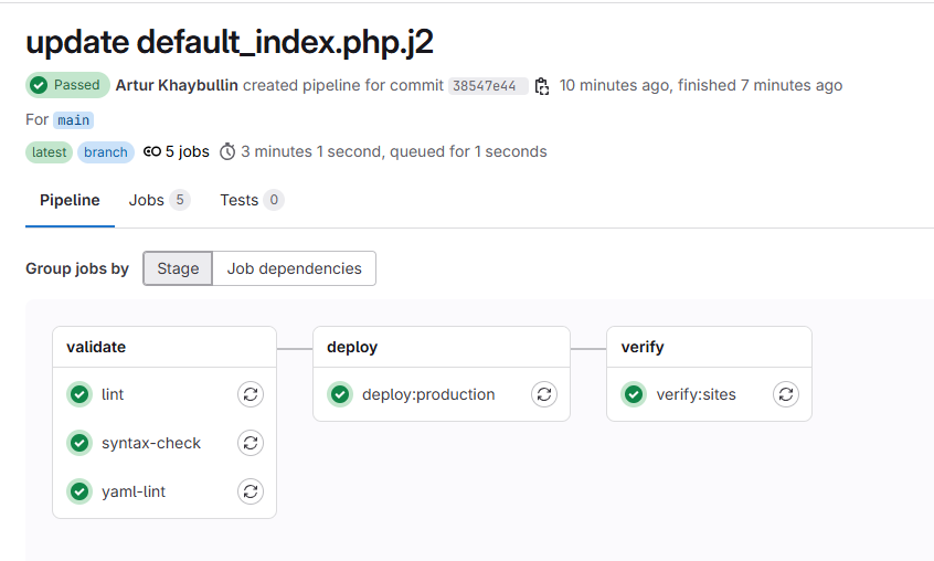 До пайплайна типичная история выглядела так: изменил шаблон nginx, запушил, через 10 минут проверяешь и оказывается что сайт лежит. Это тормозит работу. С пайплайном — если изменение сломало nginx-конфиг, syntax-check поймает это ещё до деплоя. Если деплой прошёл, но что-то не так запустилось — verify:sites покажет это сразу, пока разработчик ещё смотрит на пайплайн.