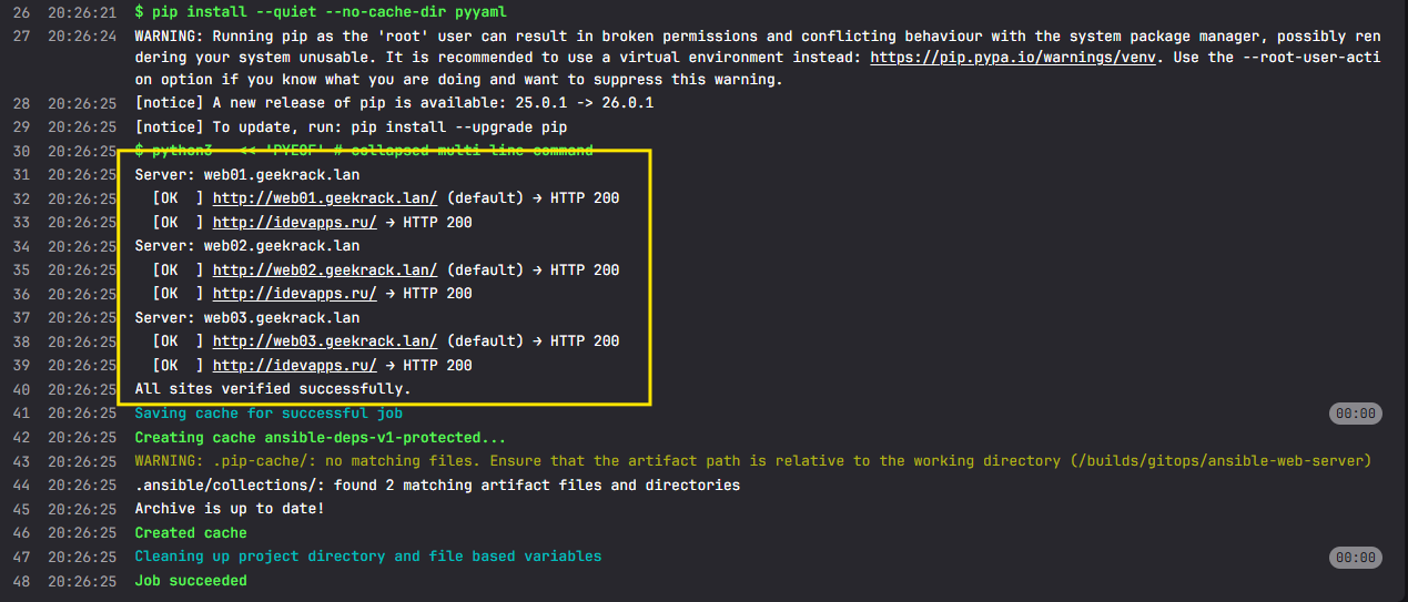 Если хотя бы один сайт вернул 4xx/5xx или не ответил — джоб падает, пайплайн красный. В логах видно конкретно какой сайт и какой код вернул.